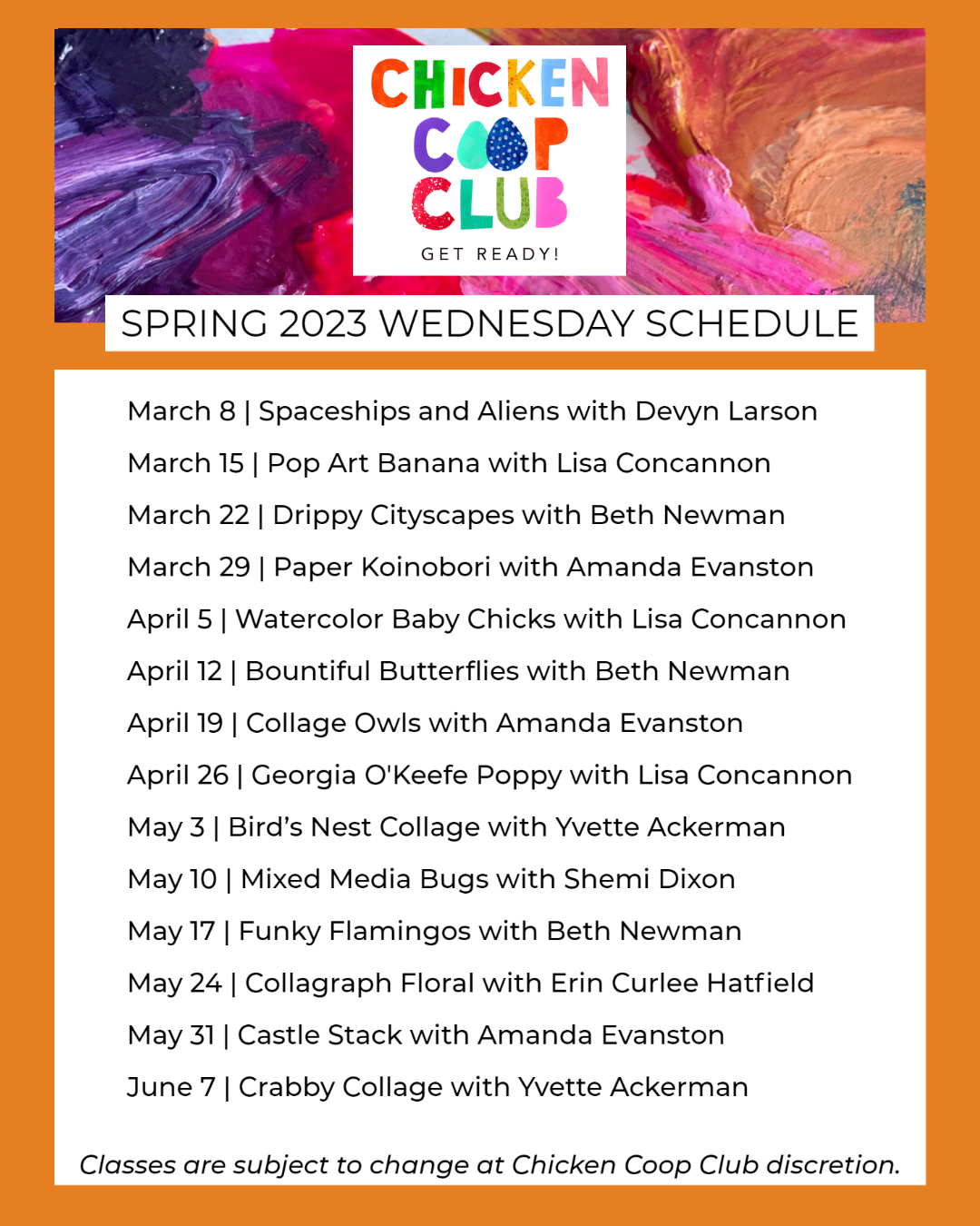While classes are directed at the student artists, we know they are supported by adults who may have questions. That's why we send periodic member emails to share Chicken Coop Club news and offer art making tips and tricks!